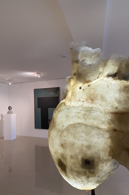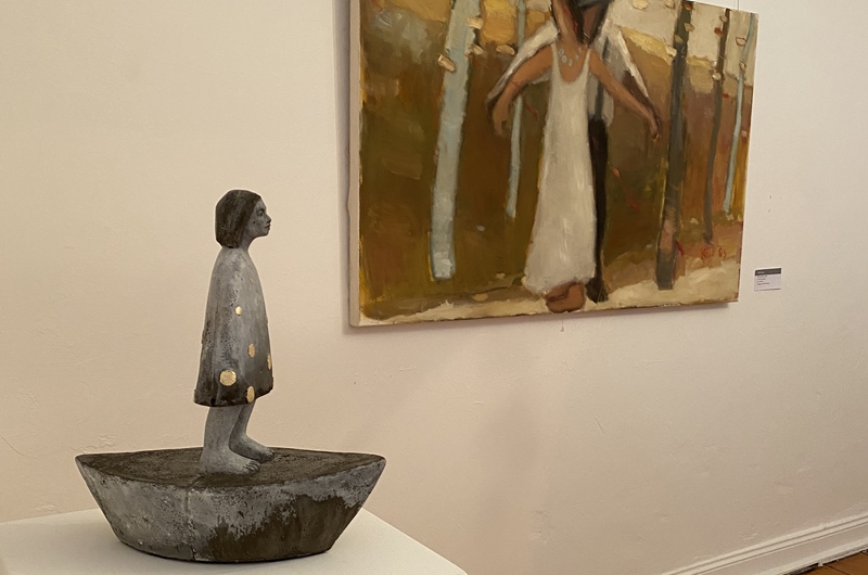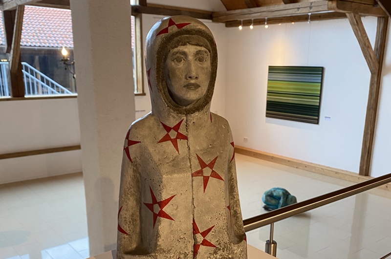 Die Augen ihrer Figuren haben in der Regel keine Pupille, sie fokussieren also das Gegenüber nicht und schauen durch einen hindurch in die Ferne. Dadurch sind sie zugleich physisch anwesend, wirken aber auch abwesend, entrückt, melancholisch und sehnsüchtig – und schaffen stets einen zeitlosen, weiteren Raum jenseits des greifbaren Ortes und des Betrachters. Sie überprüfen die Beziehung zu sich selbst und untereinander, sie vereinen die Gegensätze zwischen Abkapselung und in Verbindung treten, zwischen Zerstreuung und Fokussierung. Die Künstlerin arbeitet mit der sogenannten verlorenen Form, also der Negativform aus Gips.